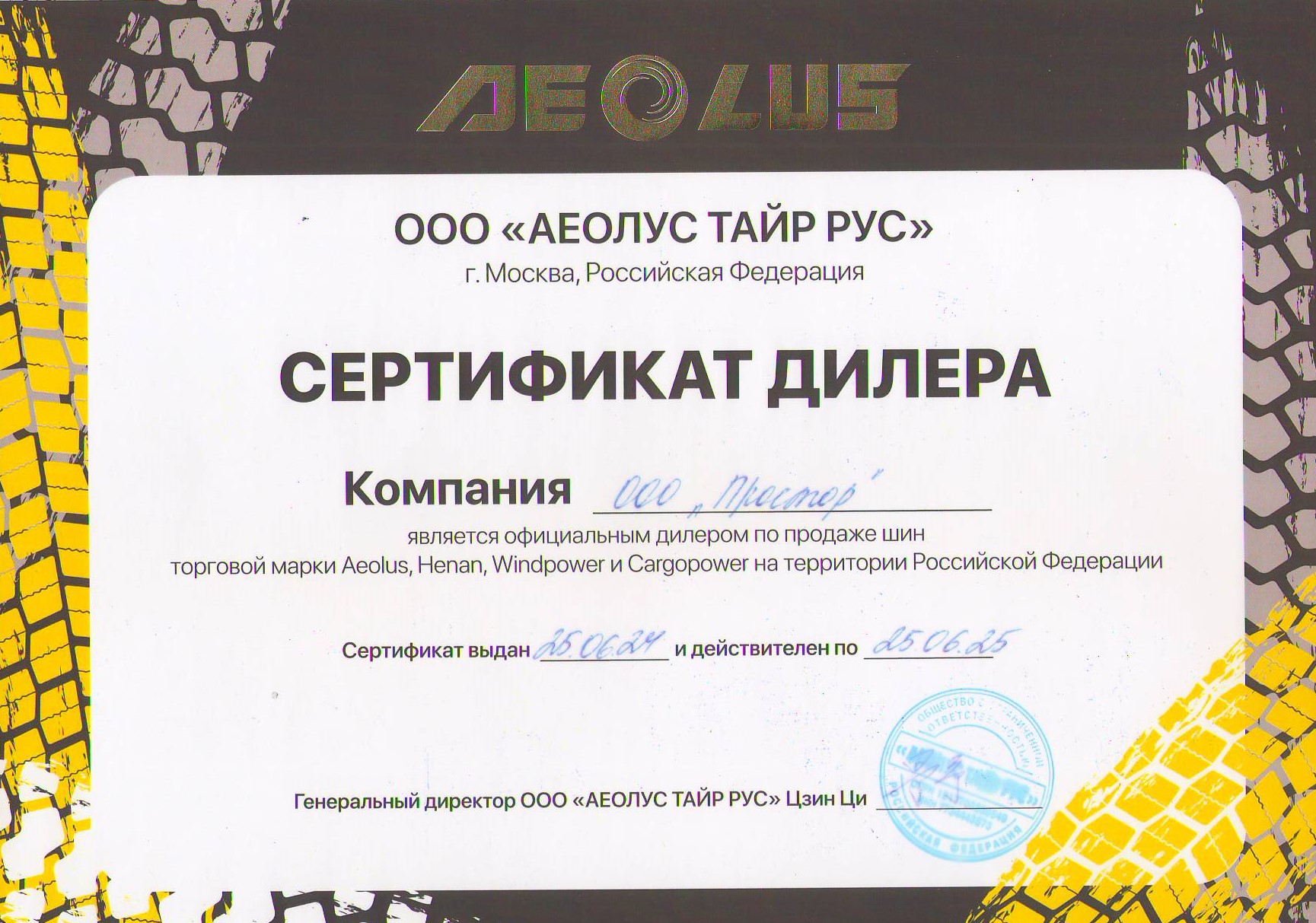- официальным дилером китайского завода AEOLUS TYRE CO., LTD ( шины марки: AEOLUS/HENAN)
