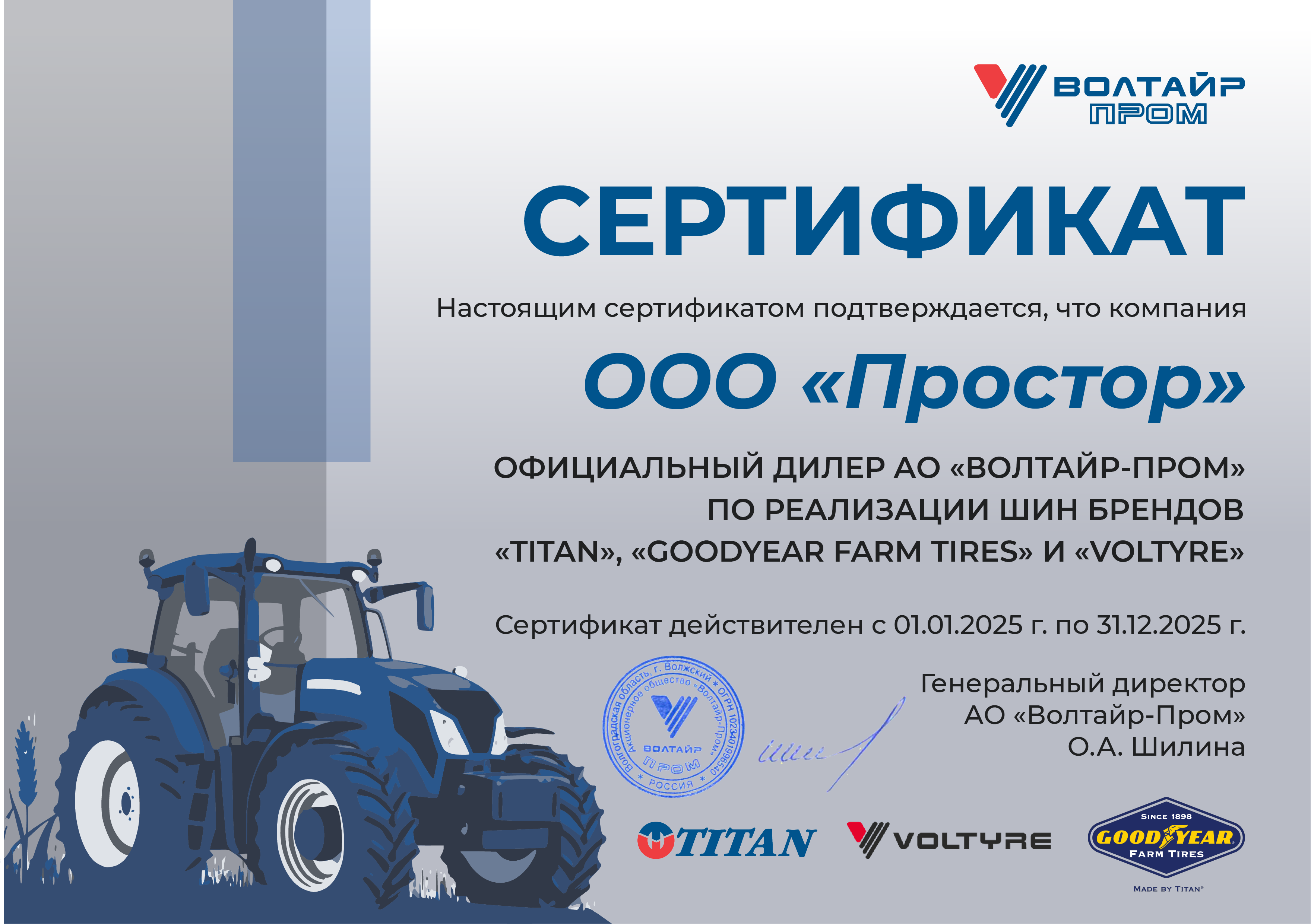 - официальным дилером АО "Волтайр-Пром" (региональный склад) шины марки: VOLTYRE, TITAN и GOODYEAR FARM TIRES